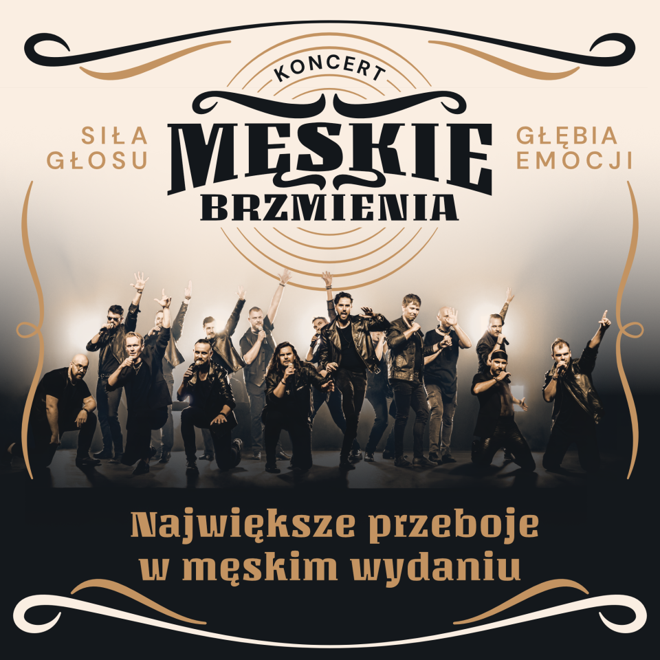 Czas na wyjątkowe show! MĘSKIE BRZMIENIA, pierwszy w Polsce profesjonalny męski chór rozrywkowy, przejmuje scenę, nadając polskim i światowym przebojom nową, oryginalną formę. Podczas koncertu usłyszysz znane utwory pełne energii, refleksji i mocnych dźwięków w zupełnie nowych, unikalnych aranżacjach. MĘSKIE BRZMIENIA to doskonałe połączenie dynamicznych rockowych hitów, klimatycznych ballad oraz niezapomnianych kompozycji muzyki filmowej.